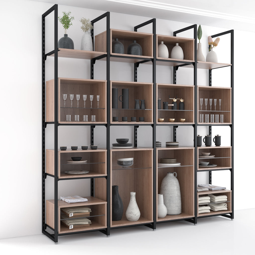 Height-adjustable glass shelves provide additional flexibility for the presentation of goods. The sturdy construction ensures a high load-bearing capacity.
