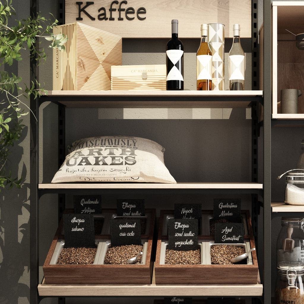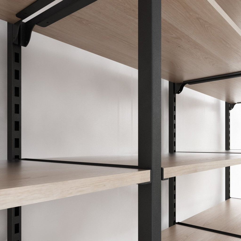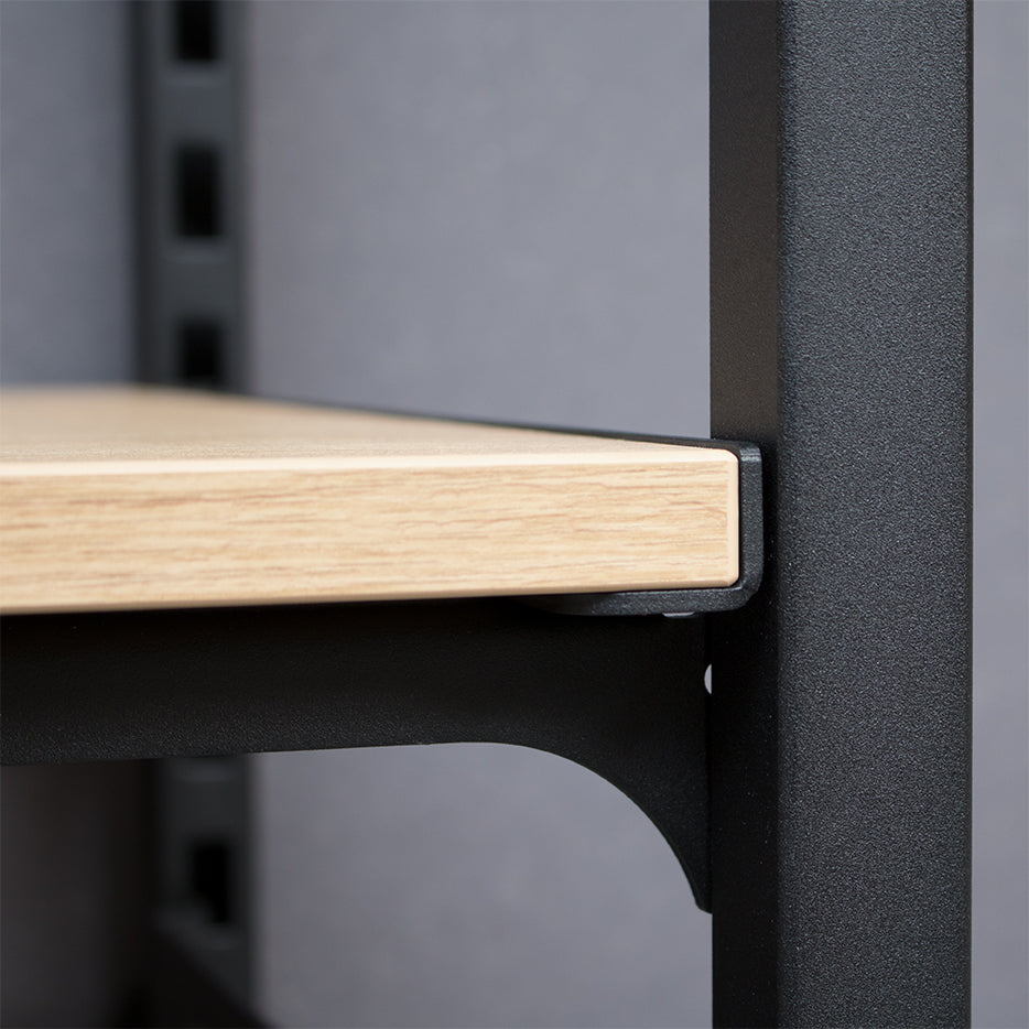 The two shelf brackets are each attached to the shelfboard at the side by two screws. The bracket for wooden shelves has a powder-coated black structure. The complete shelf board can be hooked into the Addison shelving system at the desired height easily and without tools. We recommend the use of shelf support units for heavy goods or large axle dimensions.