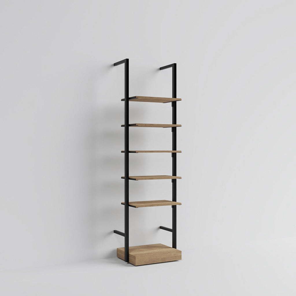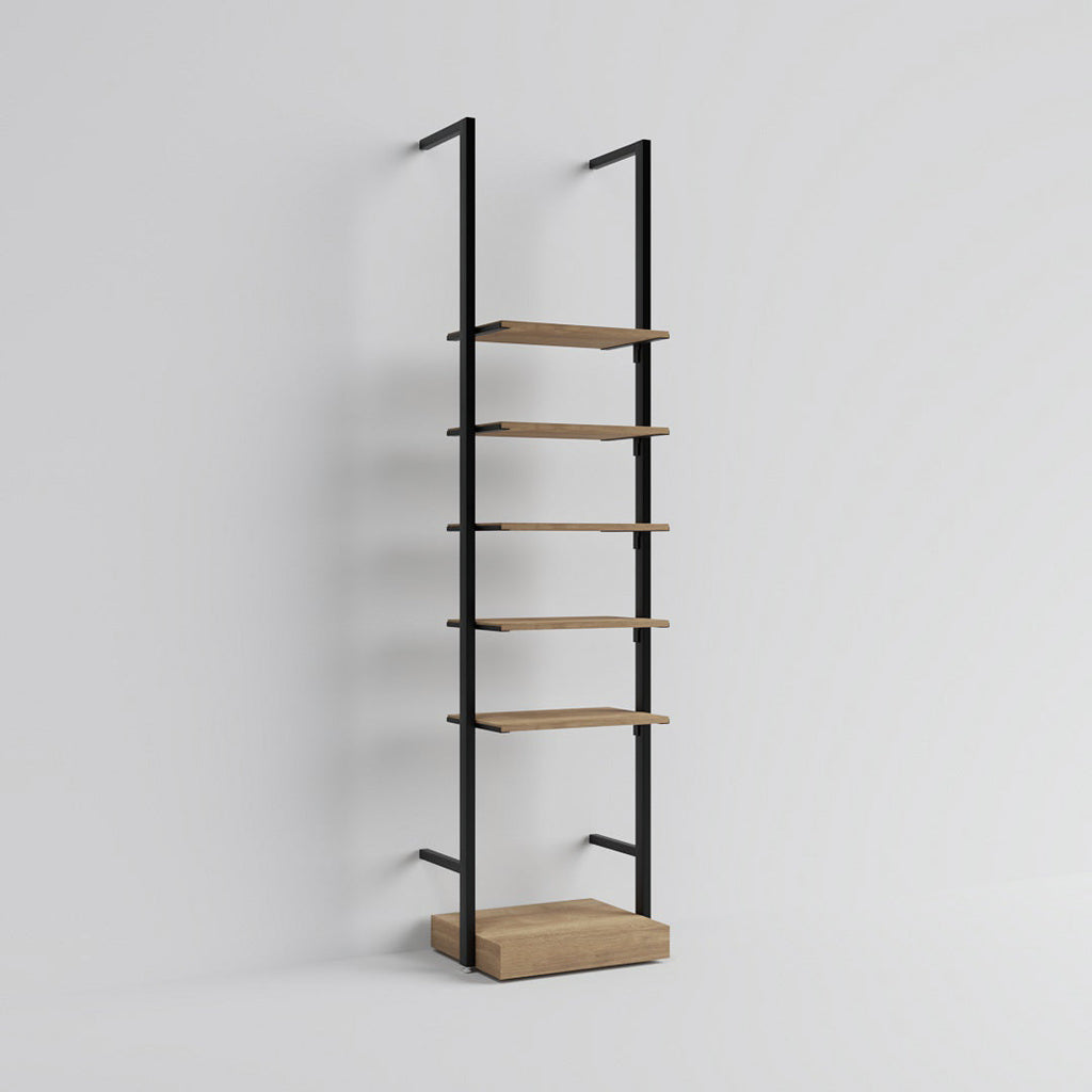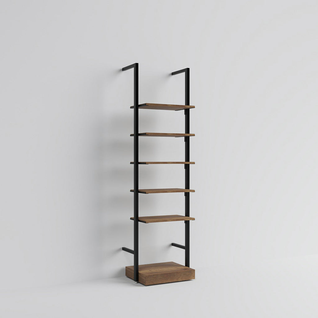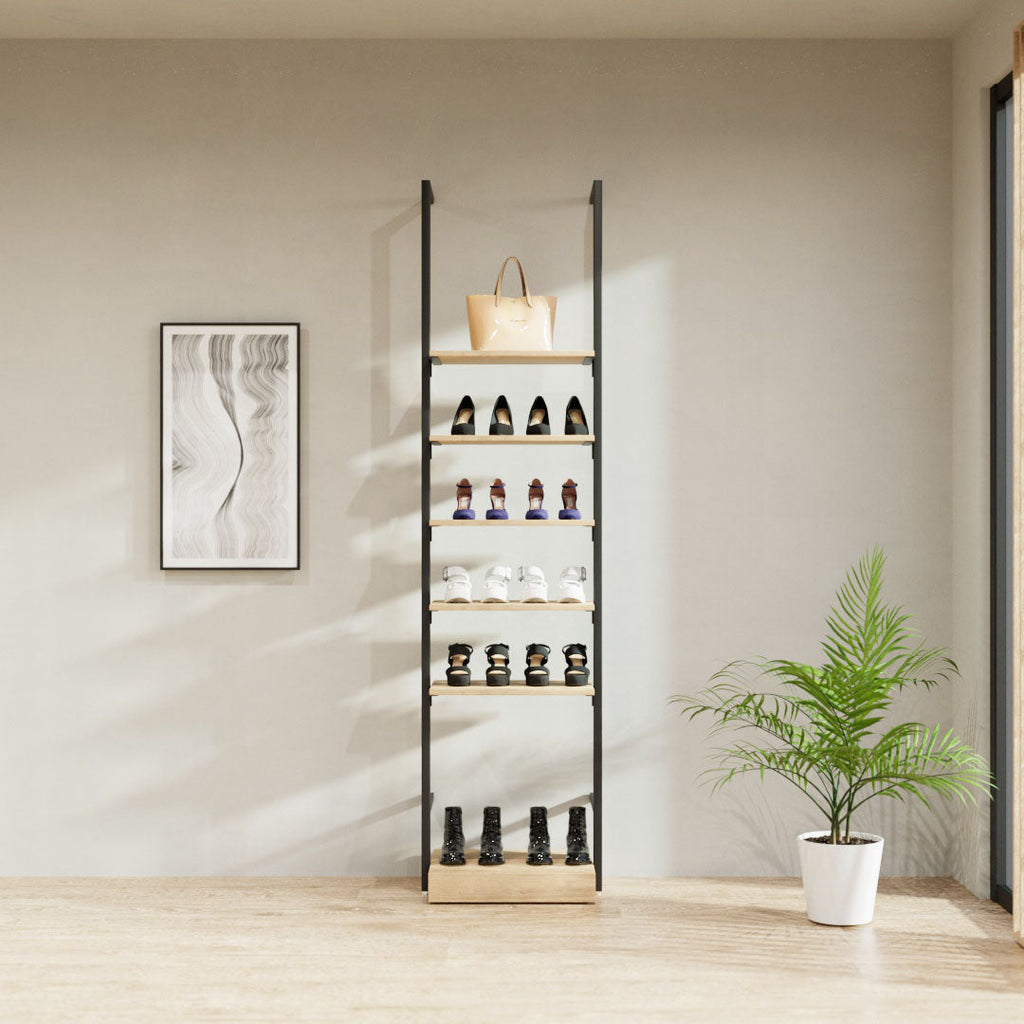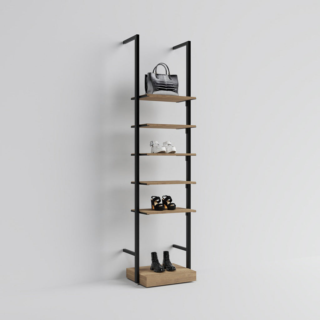 This compact wall-mounted unit is ideal for narrow spaces or as an add-on beside existing displays. With five adjustable shelves and a solid base, it’s perfect for showcasing shoes, bags, and accessories in a clean, efficient way.