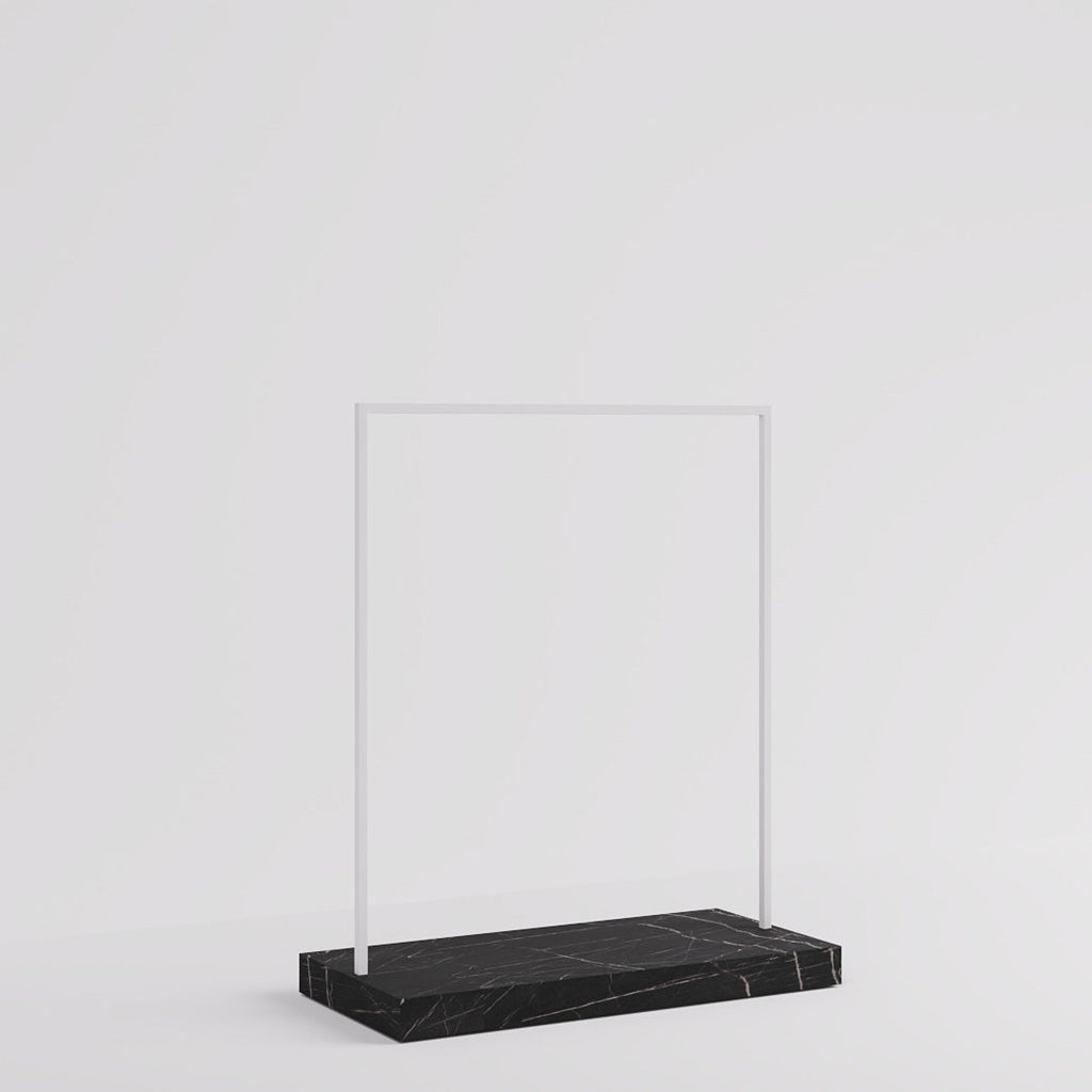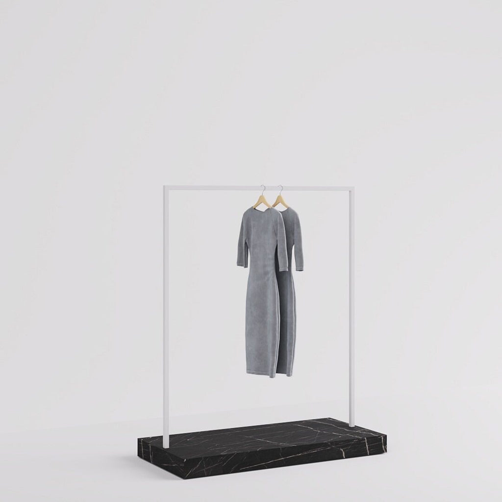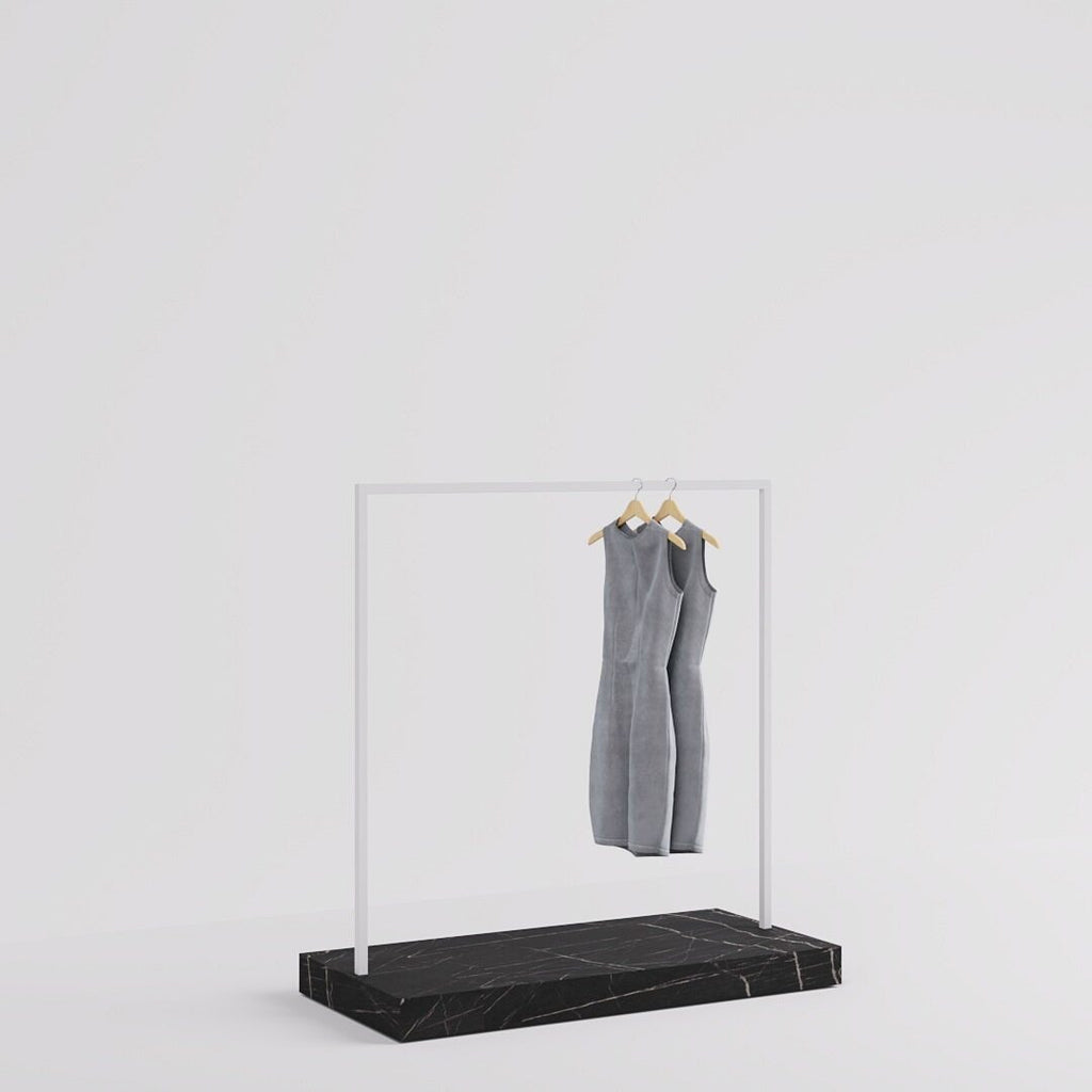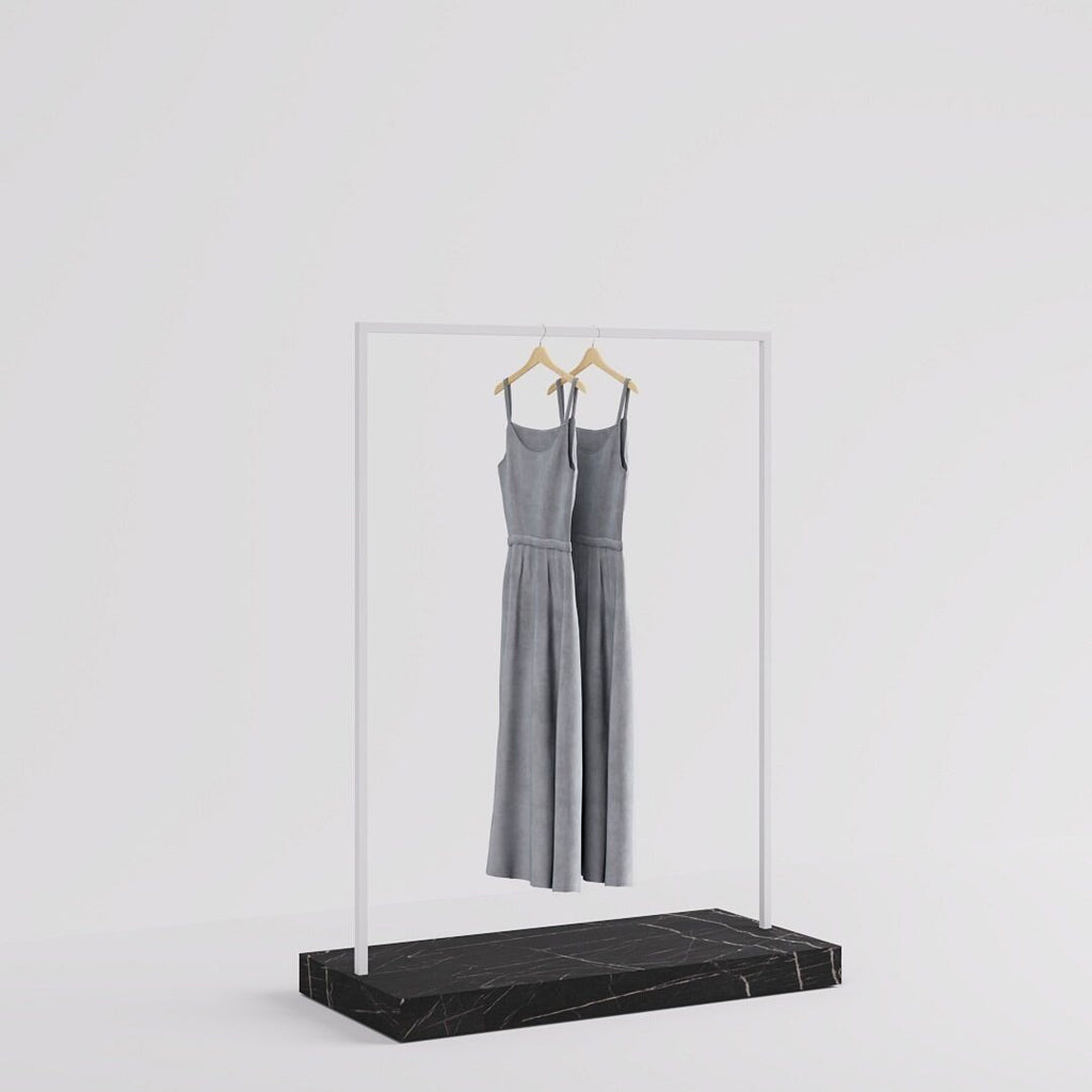 The Kansas Clothes Rail in white steel finish and marble look pedestal base combines functionality with a touch of luxury, making it perfect for boutiques. Its wide design elegantly displays clothing collections, while the marble-look base adds sophistication. Customizable finishes ensure it complements any store interior.