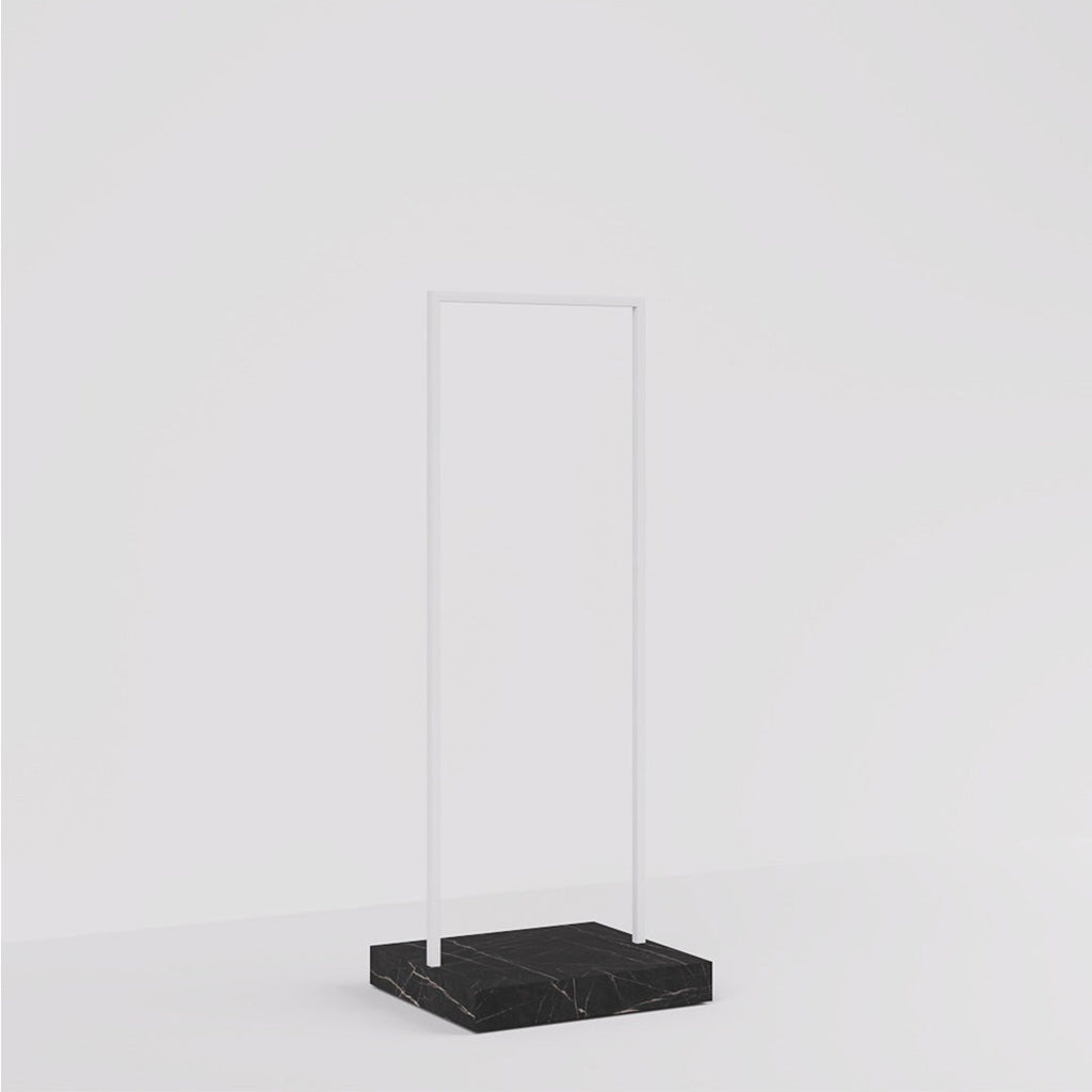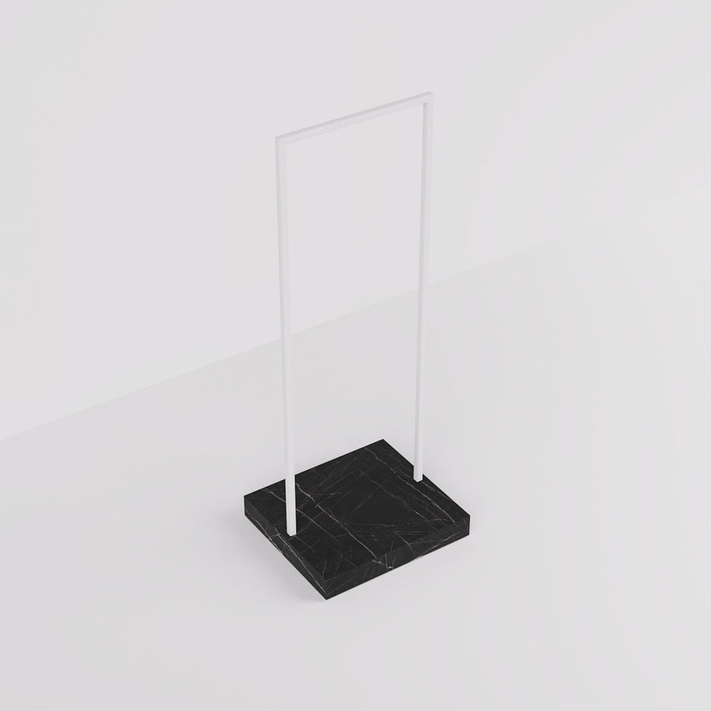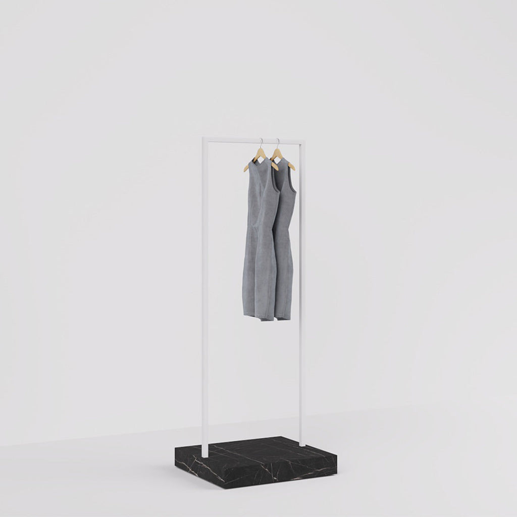 The Kansas Clothes Rail combines a sleek white steel frame with a luxurious marble-look pedestal, perfect for stylish retail interiors. Customizable pedestal finishes and a slim 65 cm width make it ideal for narrow spaces like walkways and display windows.