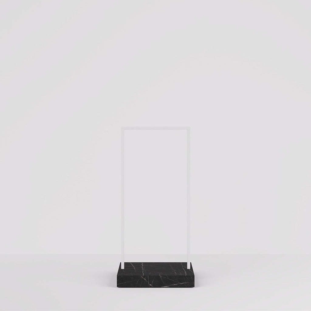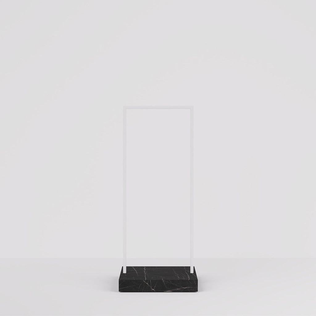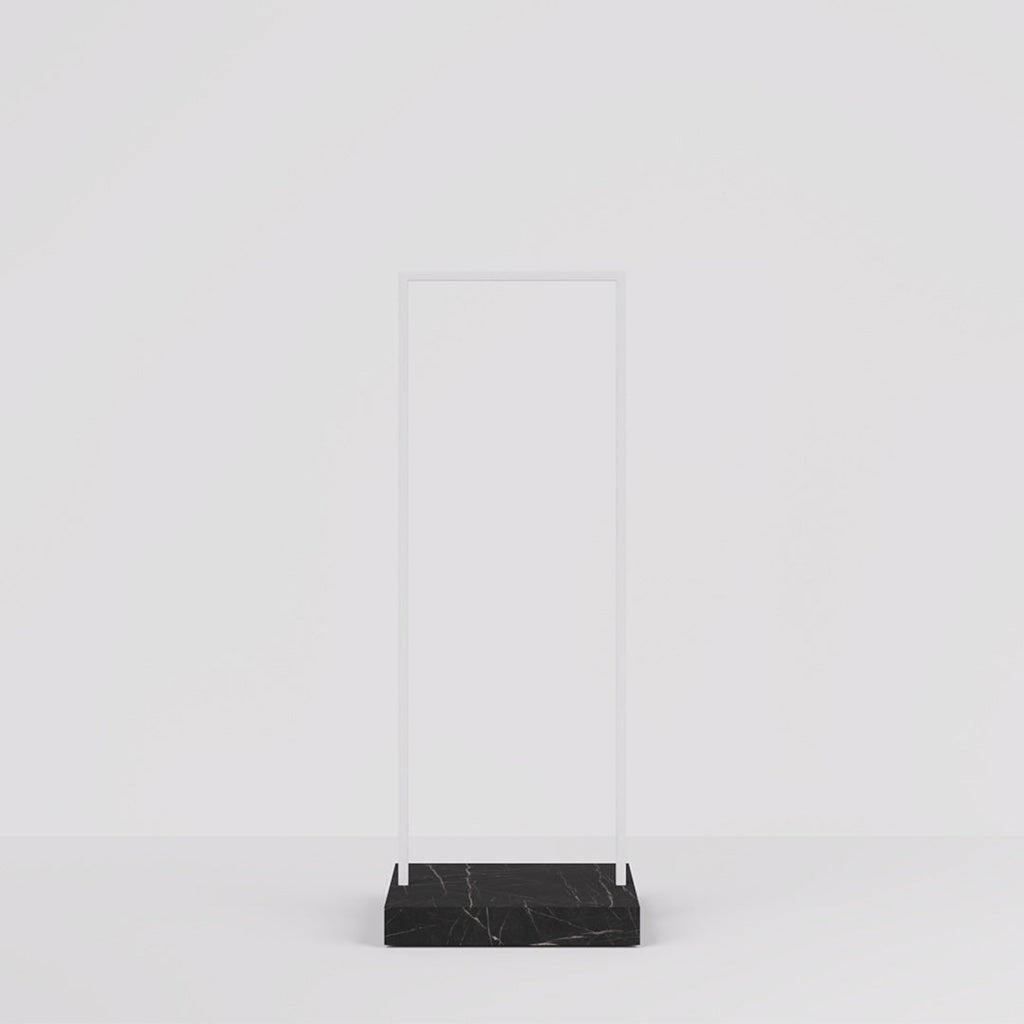 The Kansas Clothes Rail combines a sleek white steel frame with a luxurious marble-look pedestal, perfect for stylish retail interiors. Customizable pedestal finishes and a slim 65 cm width make it ideal for narrow spaces like walkways and display windows.